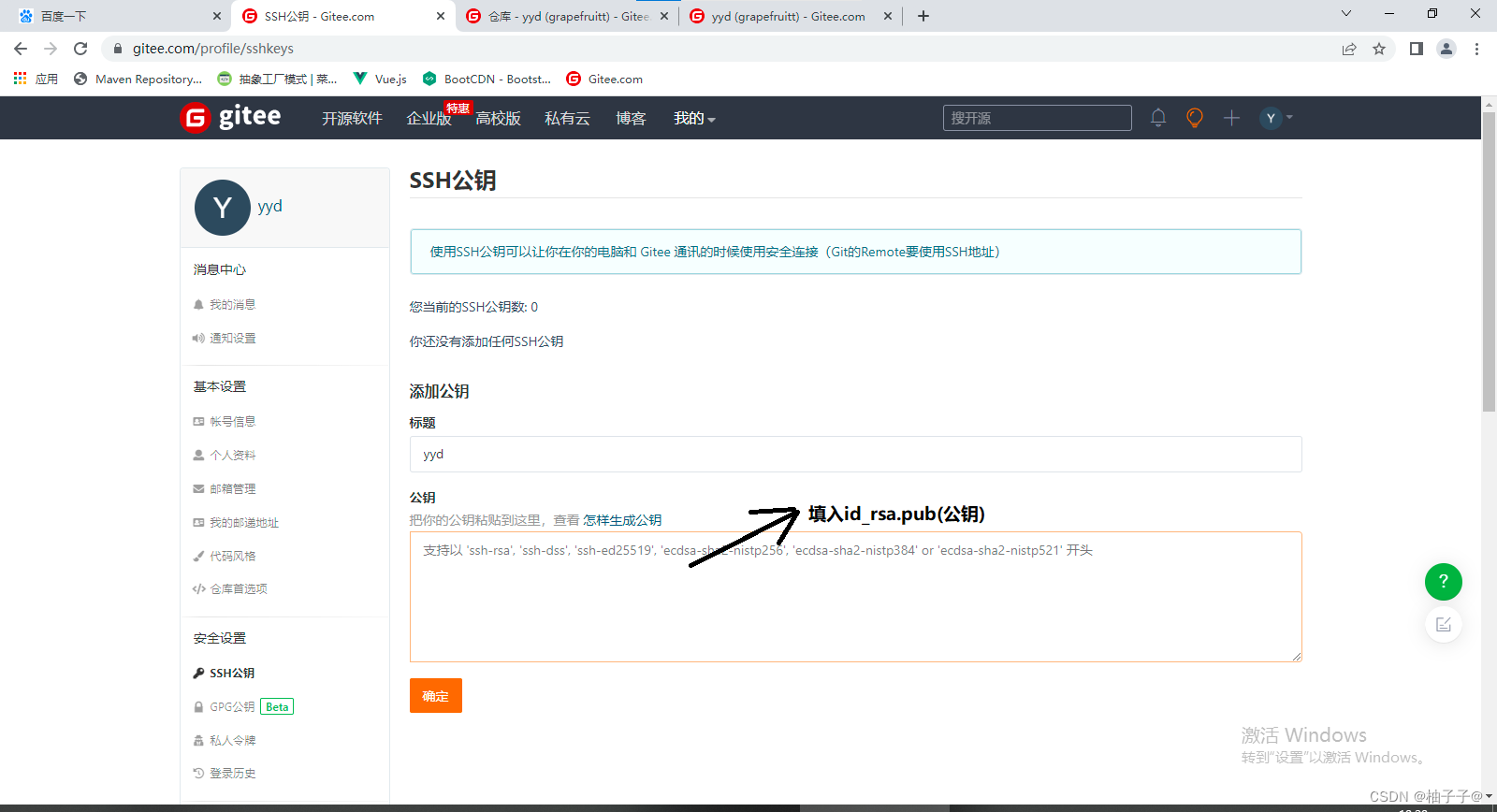 2.选择SSH公钥,取名字,复制的id_rsa.pub公钥,输入密码即可