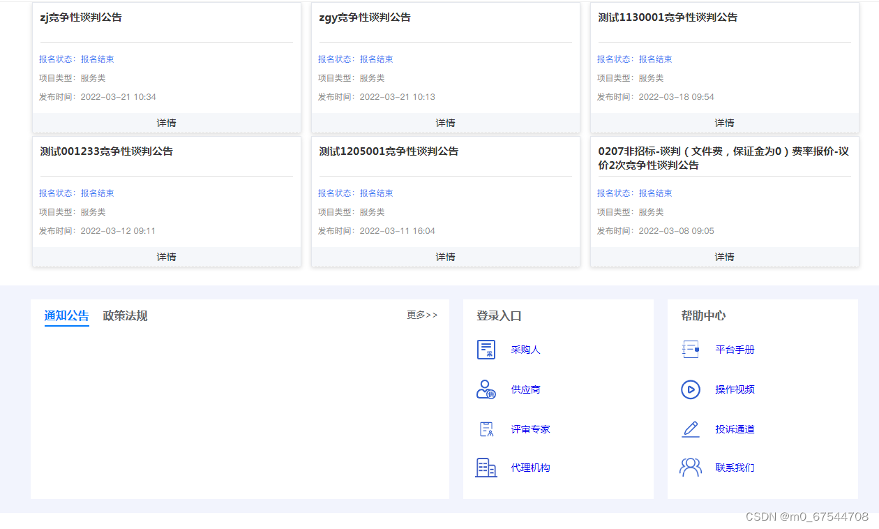 1、门户管理:所有用户可在门户页面查看所有的公告信息及相关的通知信息。主要板块包含:招标公告、非招标公告、系统通知、政策法规。
