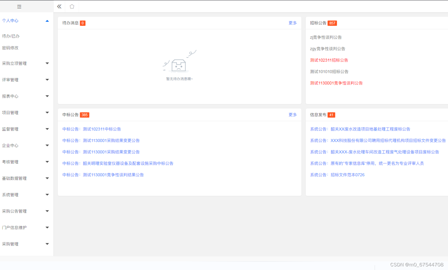 1、门户管理:所有用户可在门户页面查看所有的公告信息及相关的通知信息。主要板块包含:招标公告、非招标公告、系统通知、政策法规。