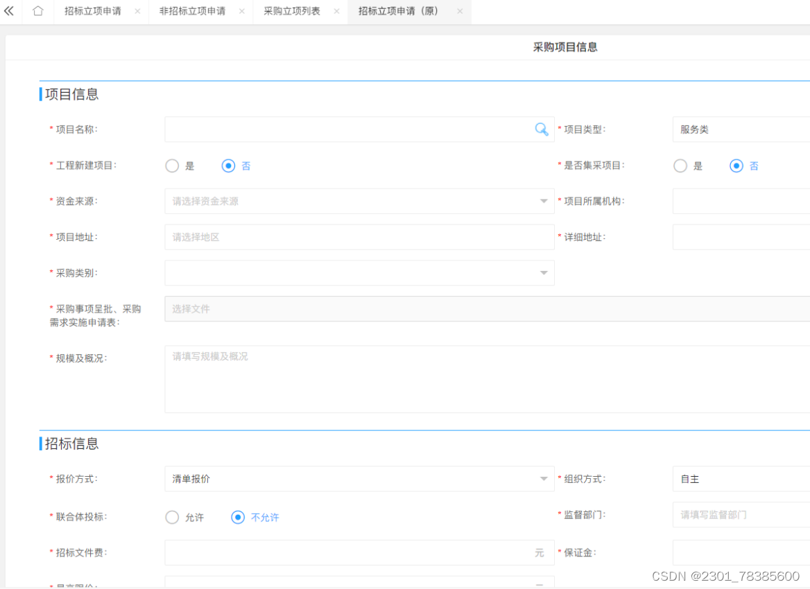 2、立项管理:企业用户可对需要采购的项目进行立项申请,并提交审批,查看所有的立项信息。主要功能包含:招标立项申请、非招标立项申请、采购立项管理。