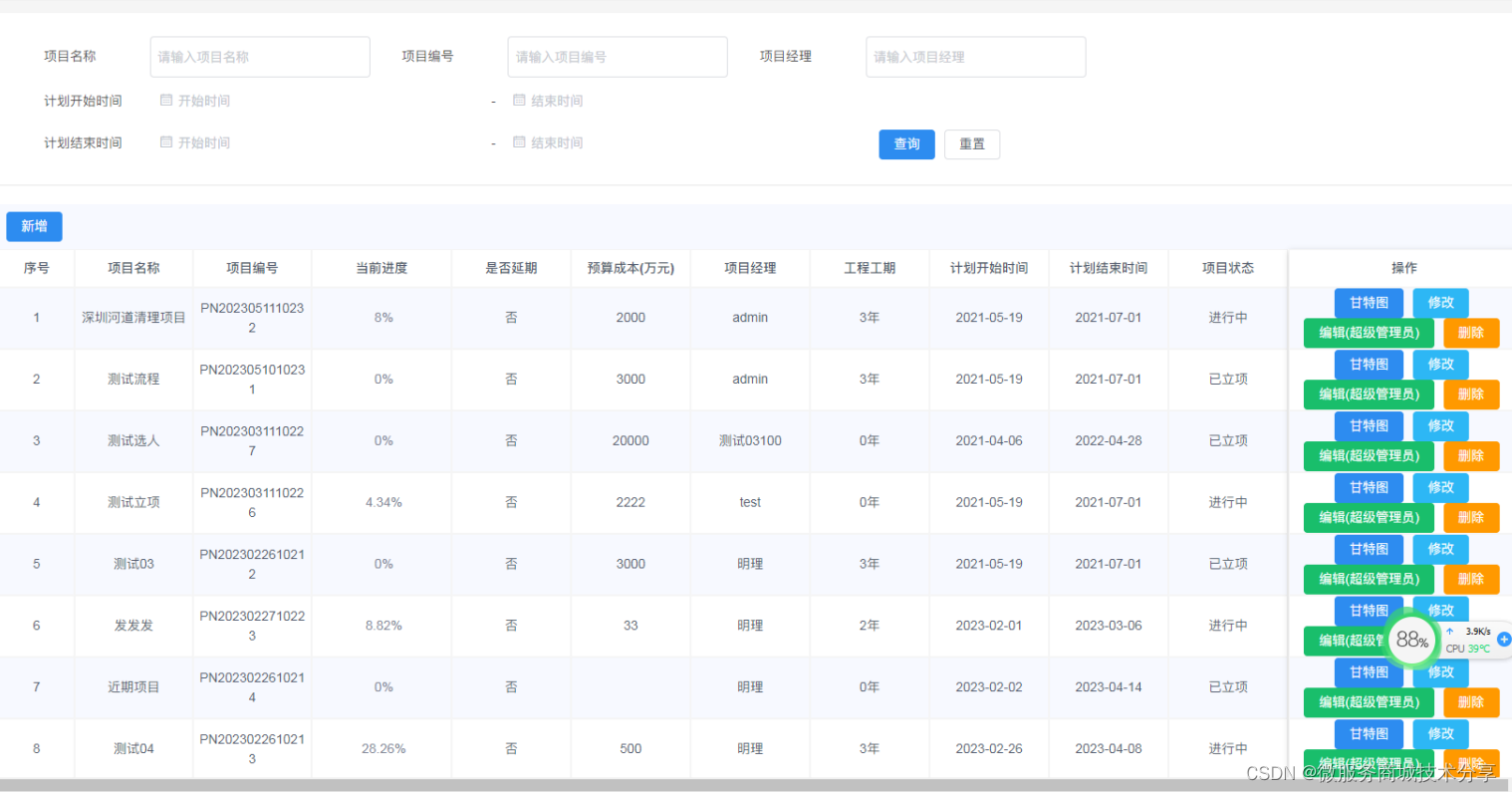 2、项目计划管理:项目计划查看和管理模块,可执行增删改查操作,包括查看甘特图