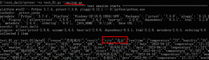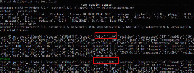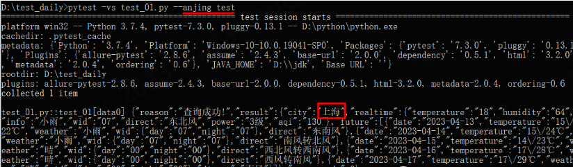 通过运行上述代码,发现已经成功将天气接口中的参数“晴”提出来,然后供下一个接口进行查询。