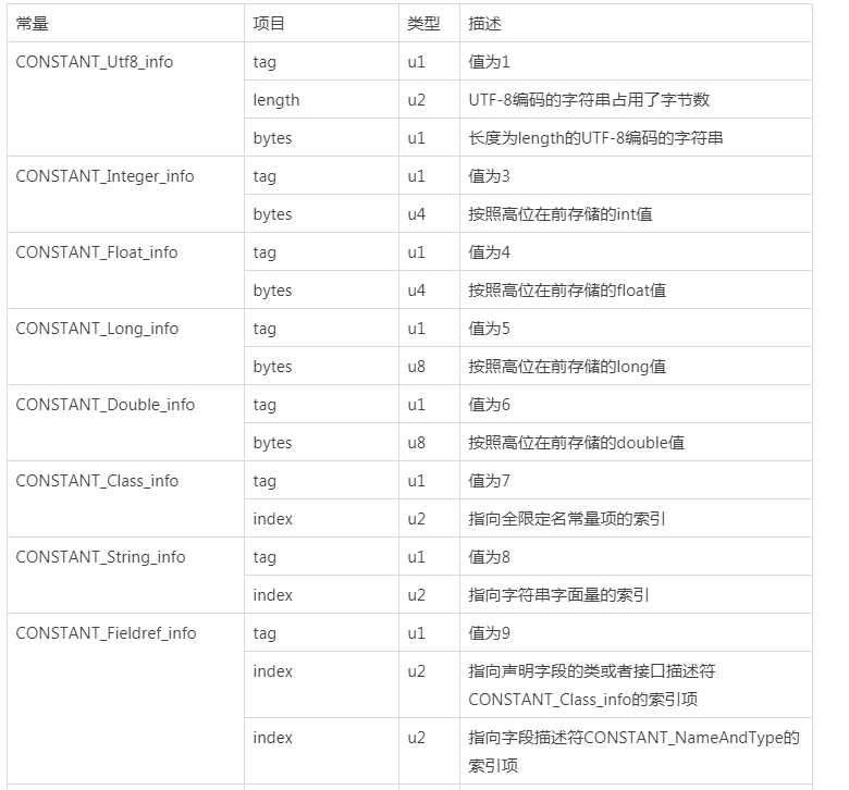 常量池17种数据类型的结构表