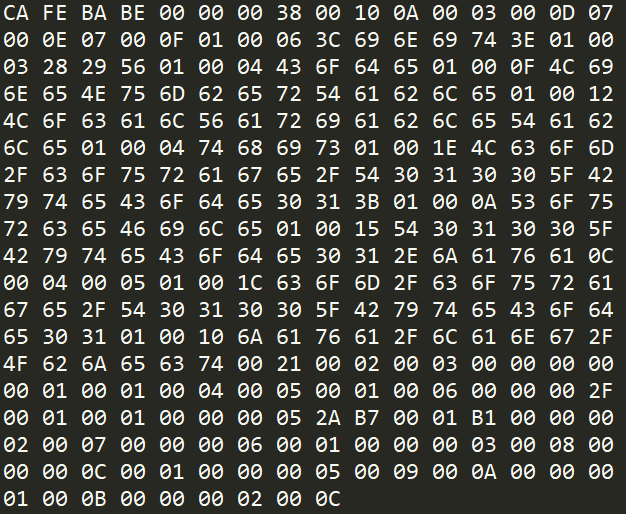 之所以说最简单,是因为这个类里面任何方法,变量都没有,看看编译之后Class文件的16进制代码:
