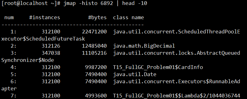 jmap -histo 6892 | head -10,查找有多少对象产生