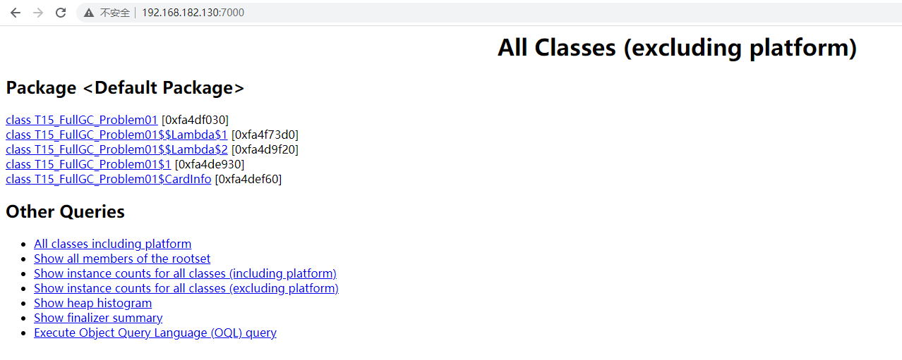 浏览器输入请求http://192.168.182.130:7000 即可查看,拉到最后:找到对应链接 可以使用OQL查找特定问题对象
