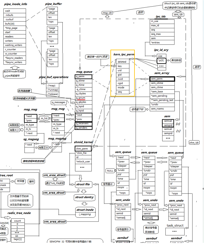 Linux内核中定义了一个核心结构体 struct kern_ipc_perm(在图中黄色标记)。它包含了所有IPC资源共有的属性: