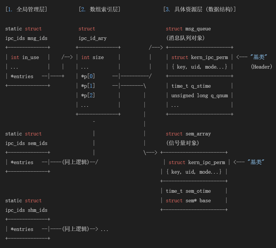 利用结构体嵌套(struct kern_ipc_perm 在首位),实现了所有IPC资源描述信息的统一,这是C语言层面的“多态”基础。 -