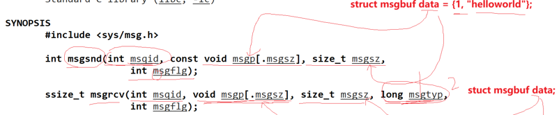 图片中的箭头指向了右上角的 struct msgbuf data = {1, "helloworld"};。这意味着你需要把这个结构体的地址传进去(例如 &data)。