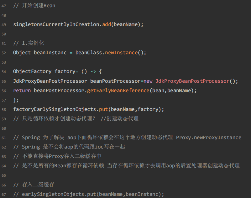 但是需要思考的是动态代理在哪创建?? 在实例化后直接创建?但是我们正常的Bean是在初始化创建啊。 所以可以加个判断如果是 循环依赖就实例化后调用,没有循环依赖就正常在初始化后调用。