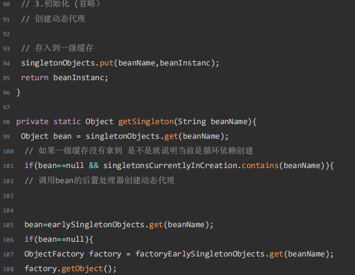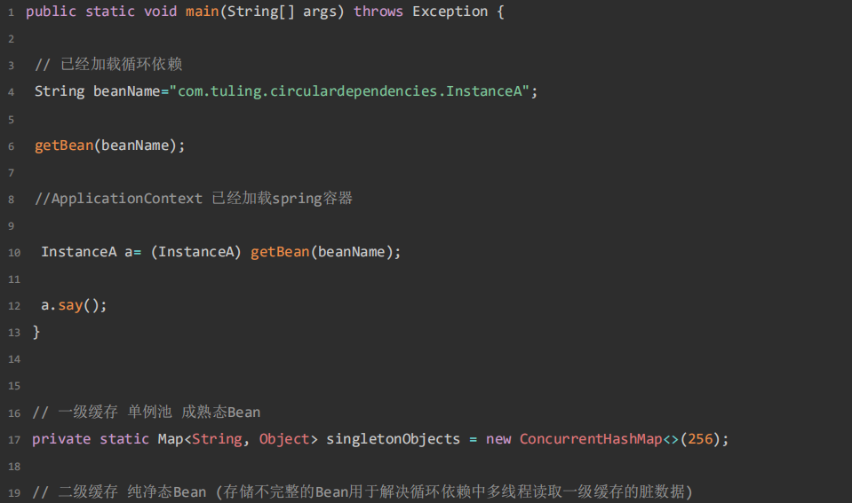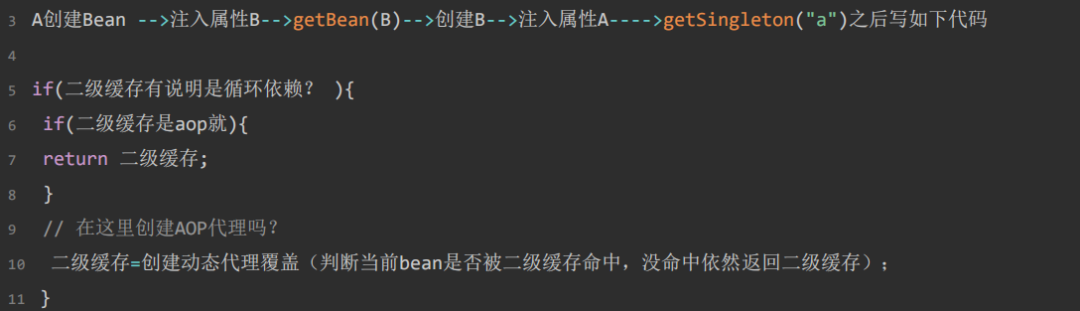 A创建Bean ‐‐>注入属性B‐‐>getBean(B)‐‐>创建B‐‐>注入属性A‐‐‐‐>getSingleton("a")之后写如下代码