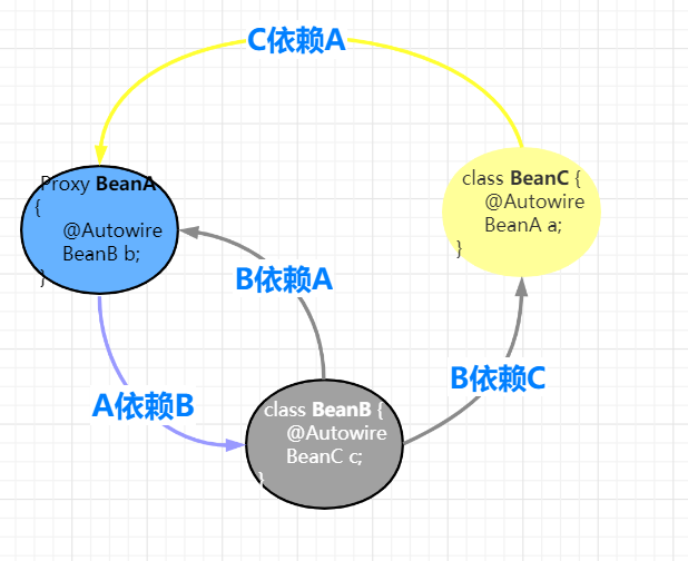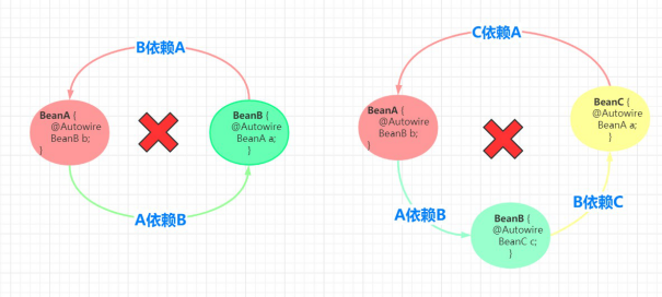 所谓的循环依赖是指,A 依赖 B,B 又依赖 A,它们之间形成了循环依赖。或者是 A 依赖 B,B 依赖 C,C 又依赖A。它们之间的依赖关系如下: