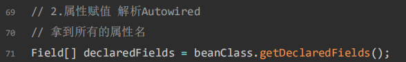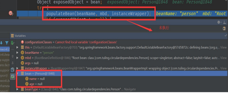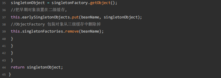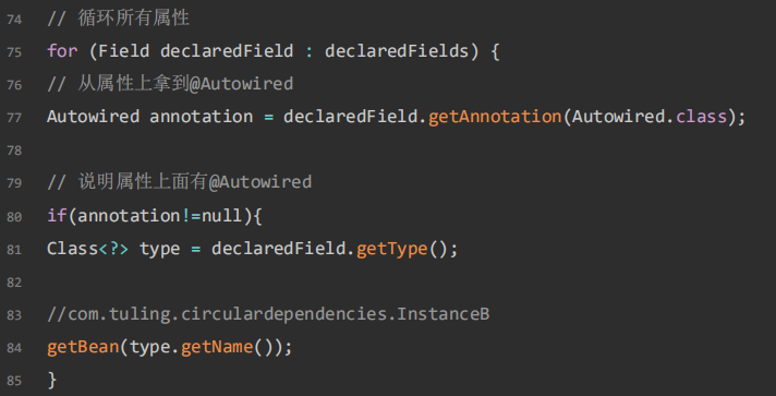 populateBean 用于向 beanA 这个原始对象中填充属性,当它检测到 beanA 依赖于 beanB 时,会首先去实例化 beanB。beanB 在此方法处也会解析自己的依赖,当它检测到 beanA 这个依赖,于是调用 BeanFactroy.getBean("beanA") 这个方法,从容 器中获取 beanA。