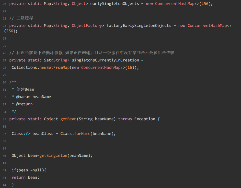 我们自己手写了解决循环依赖的代码,可以看到,核心是利用一个map,来解决这个问题的,这个map就相当于缓存。为什么可以这么做,因为我们的bean是单例的,而且是字段注入(setter注入)的,单例意味着只需要创建一次对象,后面就可以从缓存 中取出来,字段注入,意味着我们无需调用构造方法进行注入。如果是原型bean,那么就意味着每次都要去创建对象,无法利用缓存;如果是构造方法注入,那么就意味着需要调用构造方法注入,也无法利用缓存。