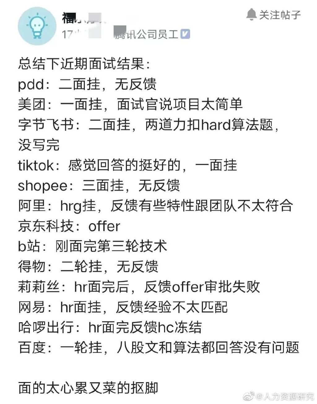 最近看到一名前腾讯员工发的帖子,总结的近期面试结果,真的就是那三个字:挂麻了……