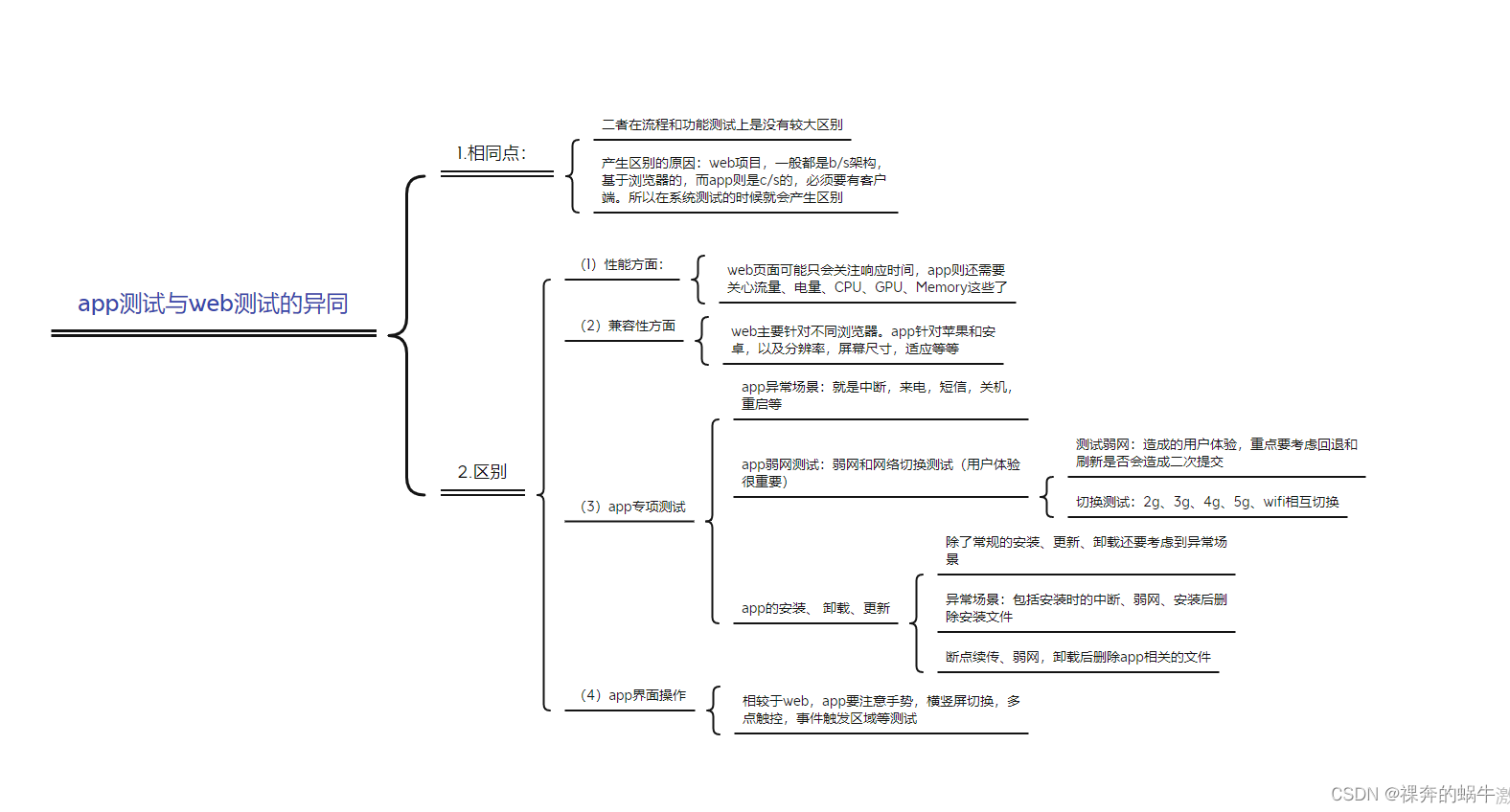 相较于web,app要注意手势,横竖屏切换,多点触控,事件触发区域等测试