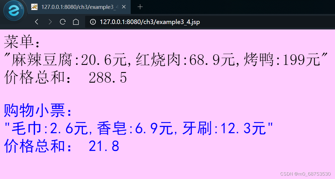 <% String str = "麻辣豆腐:20.6元,红烧肉:68.9元,烤鸭:199元";