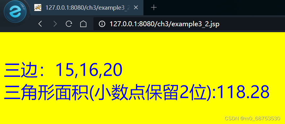 在下面的例3_2中,triangle. tag 存放在ch3\ WEB-INF\tags\example2 目录中,该Tag文件负责计算、显示三角形的面积。 example3_2.jsp 页面保存在ch3中,使用Tag标记调用triangle. tag 文件,并且向 triangle. tag传递三角形三边的长度。
