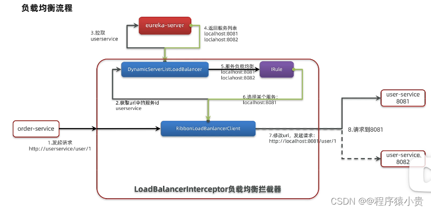 当客户端发送请求的时候,将被LoadBalancerInterceptor负载均衡拦截器拦截,然后交由RibbonLoadBanlanIncerClient处理获取请求的名字,然后将会去的名字id,交由DynamicServerListLoadBalancer处理,然后将名字交由Eureka来获取端口,并返回给DynamicServerListLoadBalancer,然后将返回的地址交由IRule处理,在返回给RibbonLoadBanlanIncerClient处理,然后就去找资源