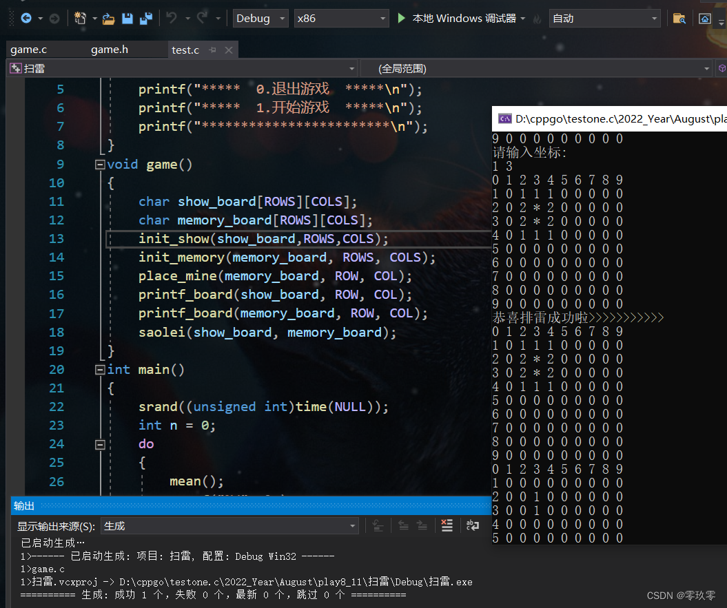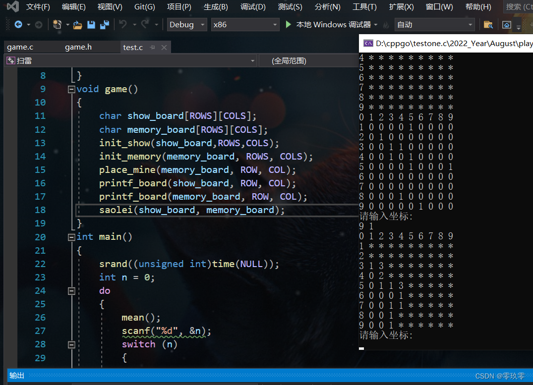 测试结果符合预期,其中存放雷的棋盘只是为了方便观察和编写程序才将其打印出来,程序完成之后将其删去。
