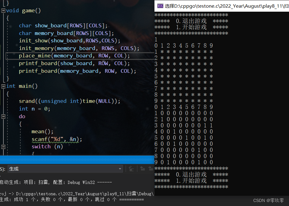 1.删去 printf_board(memory_board, ROW, COL);这个是我们存放雷的棋盘,为了方便观察才打印出来的。