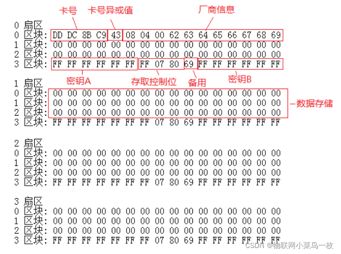 在我们连接好硬件之后,我们得去思考一个问题,它怎么能去识别卡里面的信息呢,卡里面都是怎么定义的,才能被RC522的天线给识别到。因为我使用的是M1卡,所以这里我给大家介绍下M1卡。