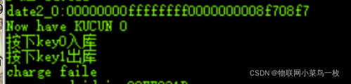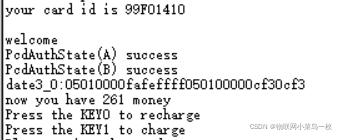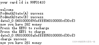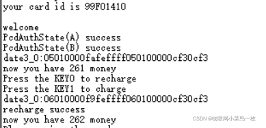 但是存放格式是小端格式存放的,实际值是0x00000105,也就是261。然后我们可以看到它提示我们按下KEY0充值,按下KEY1扣款。我们看看效果