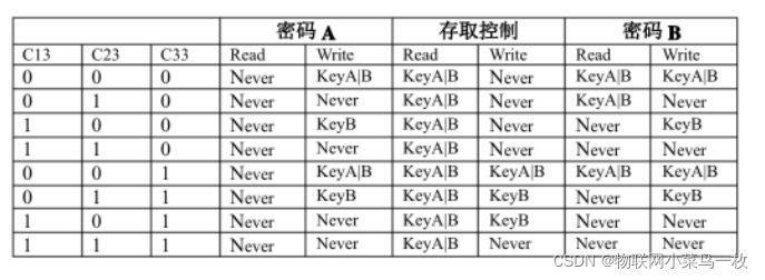 在这个表里面我们可以看出,密钥A在任何时候都不可读,其他相应的位都可以通过我们手动去修改它的访问控制位来达到读写的效果。