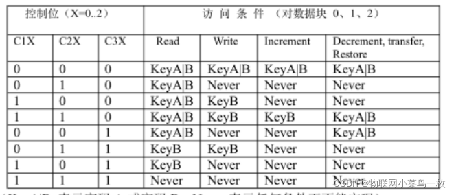 此时我们可以对照访问控制位的表,以块0为例,C10,C20,C30=000,对照表可以理解为,验证密钥A或者密钥B成功后,块0可读,可写,可增值,可减值。