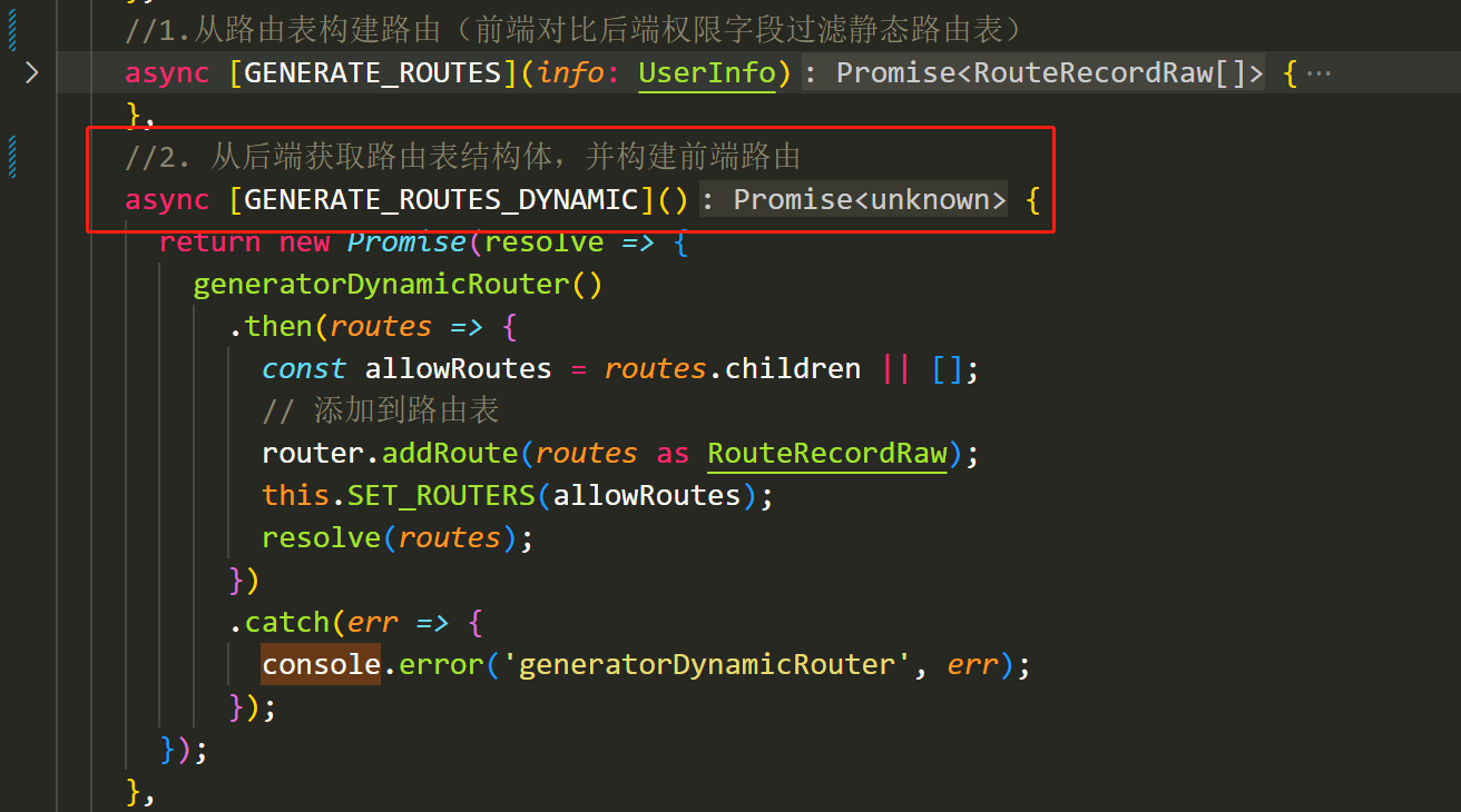 1. 在store/user.ts中,找到 GENERATE_ROUTES_DYNAMIC 方法中调用的方法:generatorDynamicRouter(),此方法在在router/router-guards/router-guards.ts中。