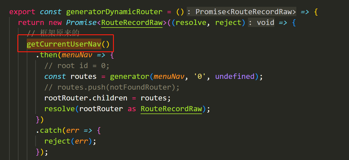 2. router/router-guards/router-guards.ts中,通过方法getCurrentUserNav(),获取到个人信息中的菜单,将菜单列表传generator()方法中,此方法将菜单列表处理成路由所需格式的路由数组。