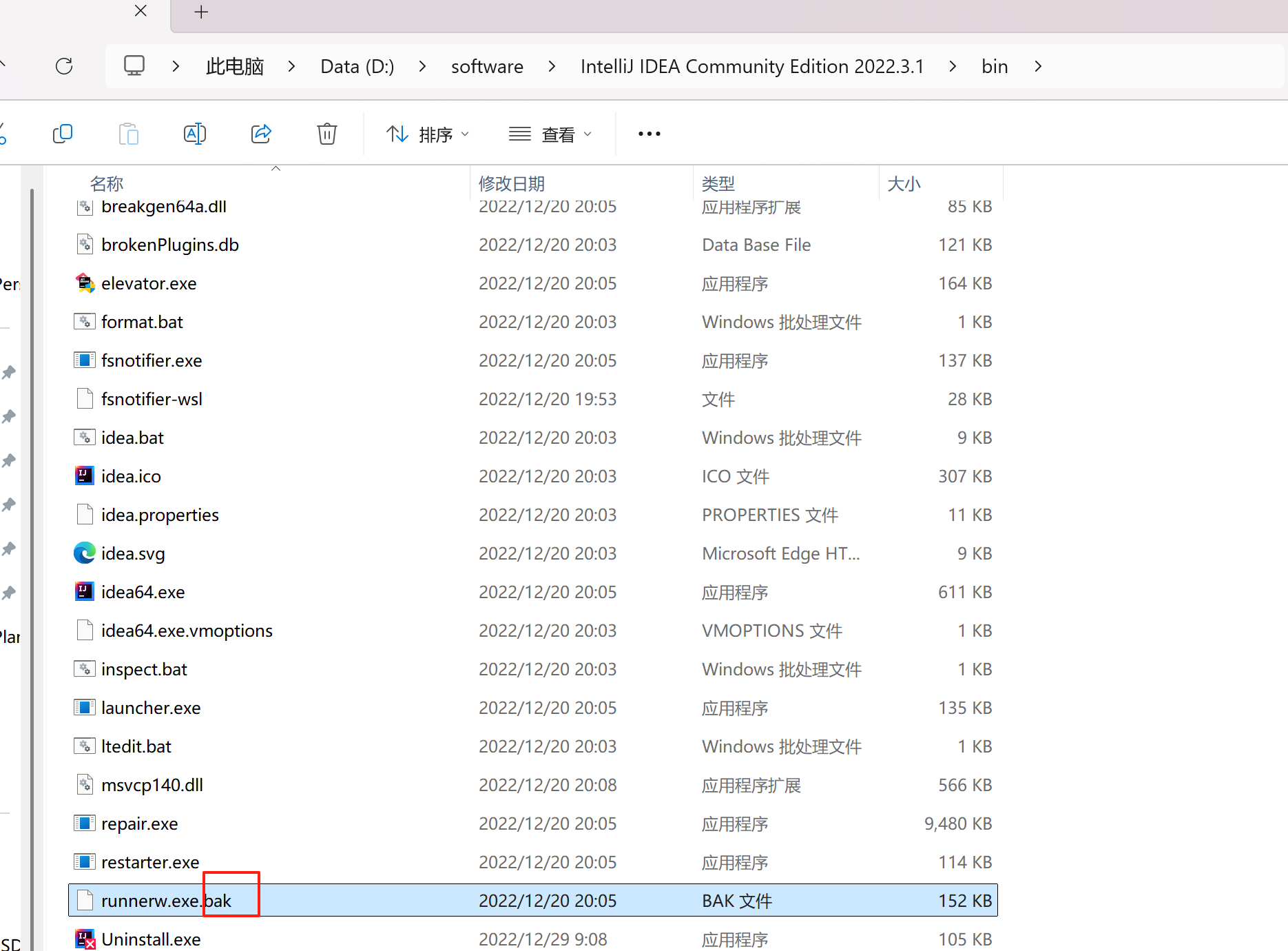 把IDEA软件的bin目录中的runnerw.exe文件名称改成runnerw.exe.bak