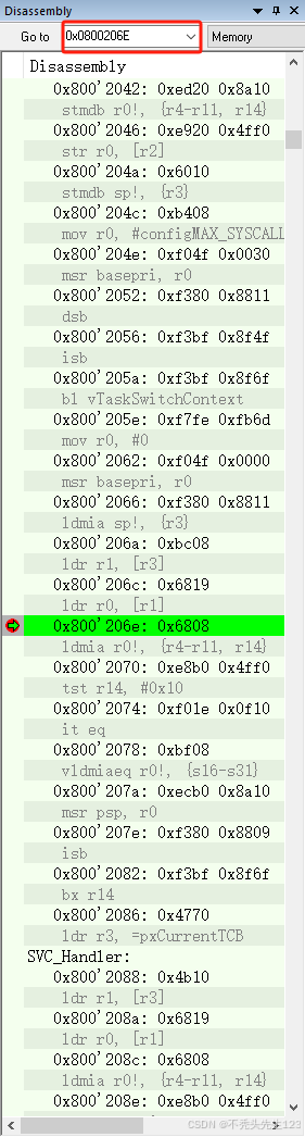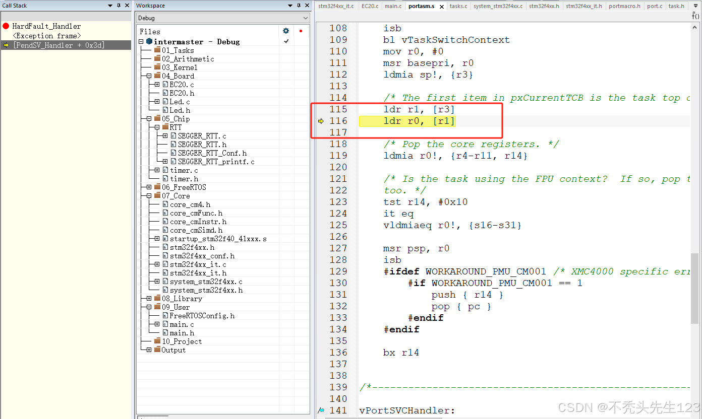 定位的位置时汇编文件,查询得知这部分位于xPortPendSVHandler是任务切换用的.