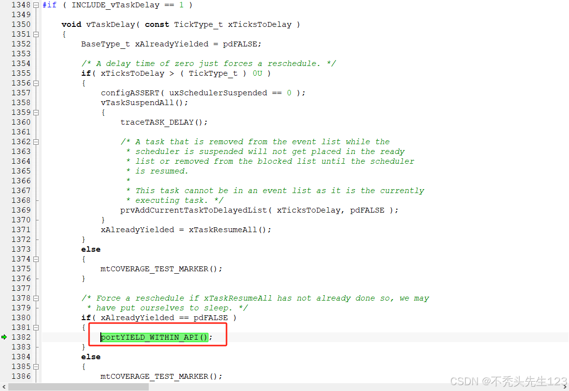 最后单步调试发现vTaskDelay,之后就跑飞了,进入vTaskDelay,继续定位