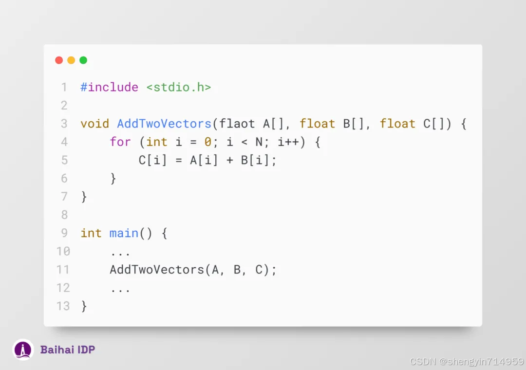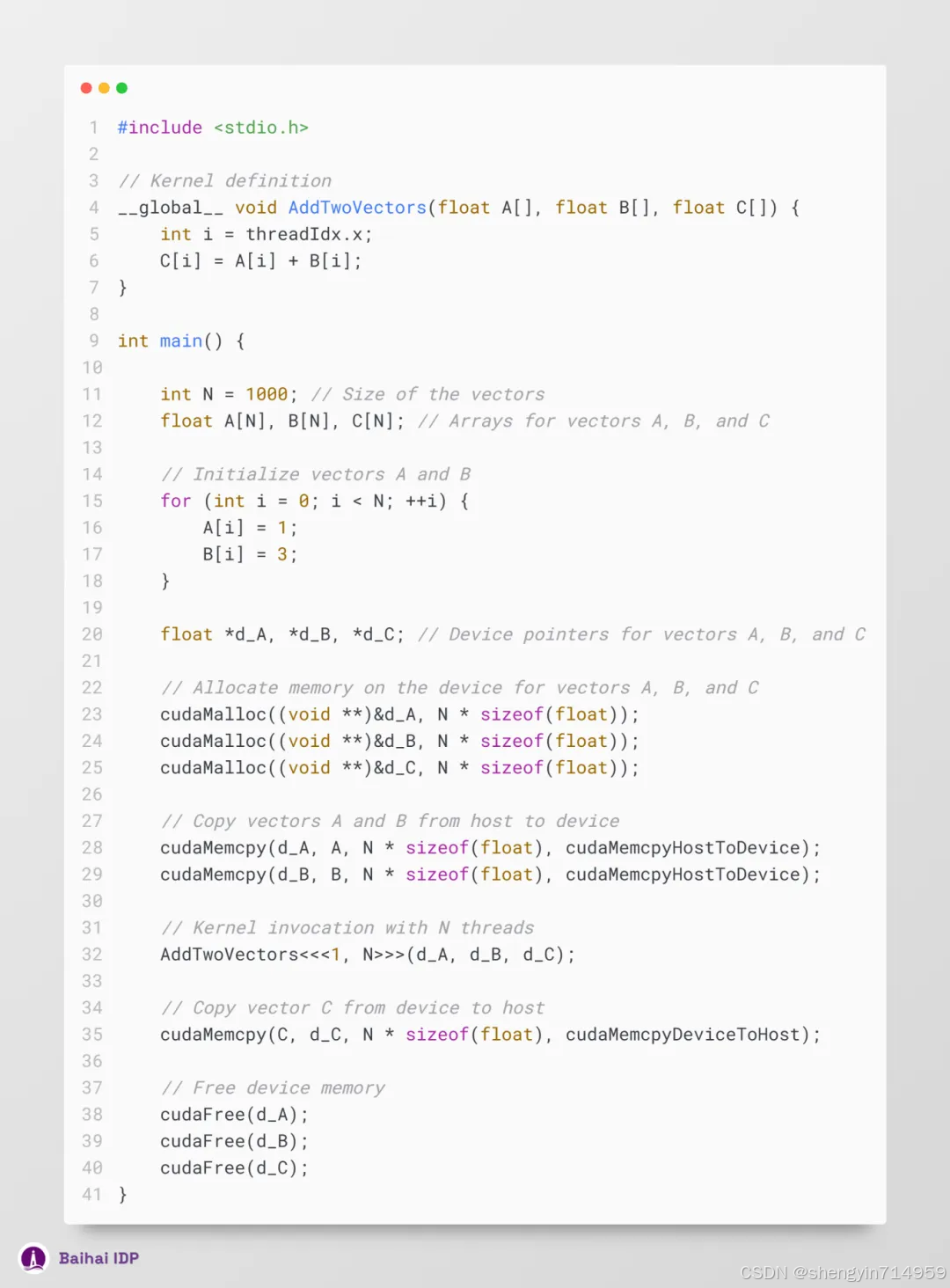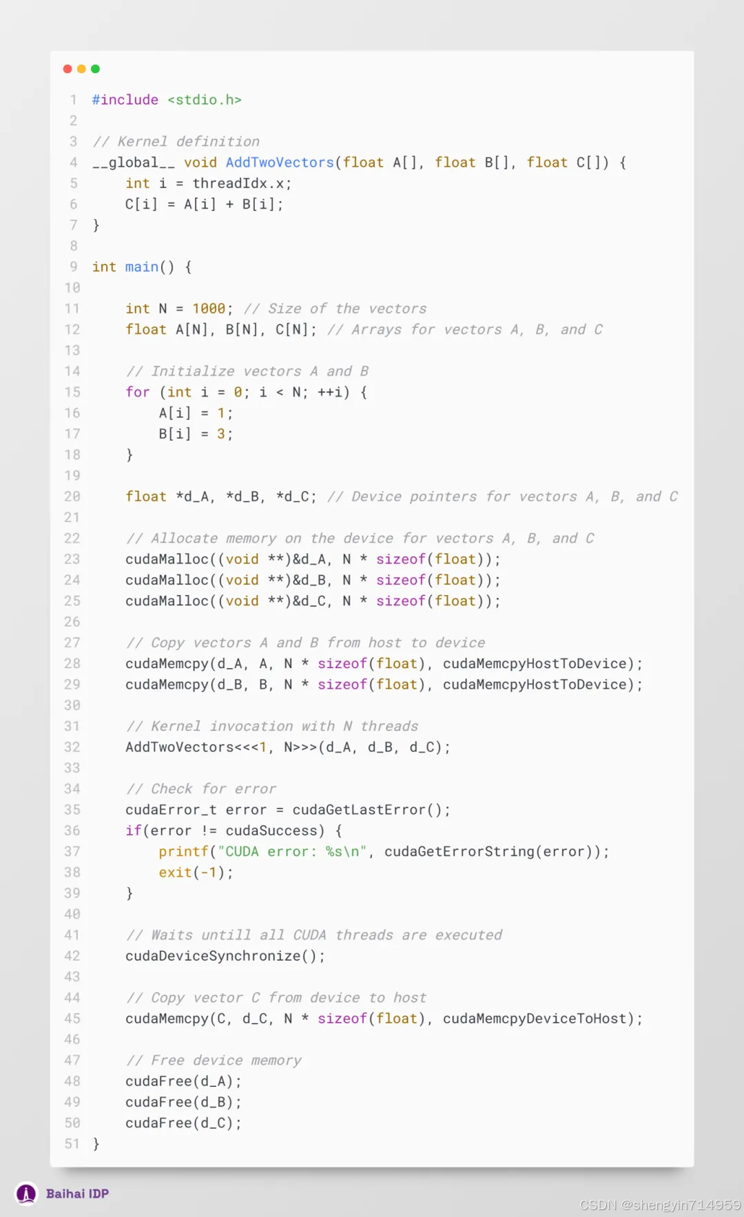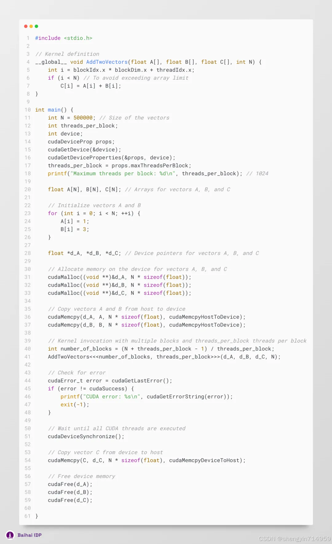 至此,我们可在代码中实现向量 A 和 B 的初始化,并在程序结尾处清理 CUDA 内存(cuda memory)。