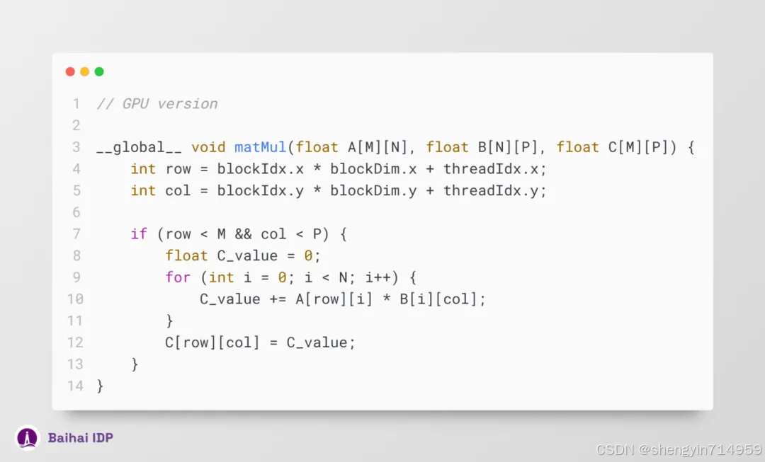 至此,我们已经掌握了 CUDA 编程的核心概念,现在可以着手构建 CUDA kernels 了。对于深度学习模型而言,其实质就是一系列涉及矩阵(matrix)与张量(tensor)的运算操作,包括但不限于求和(sum)、乘法(multiplication)、卷积(convolution)以及归一化(normalization )等。举个例子,一个基础的矩阵乘法算法,可以通过以下方式实现并行化: