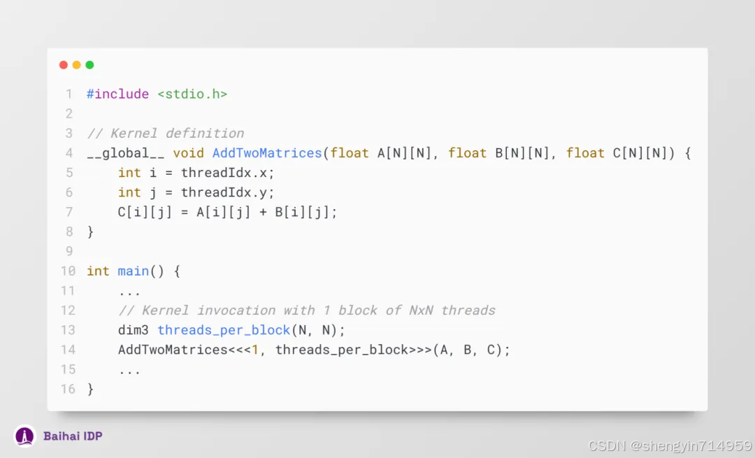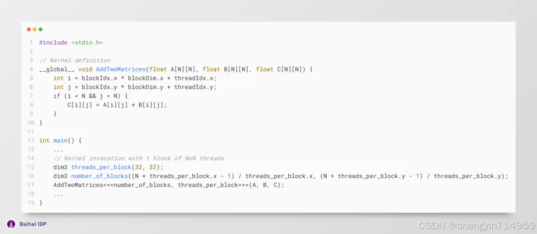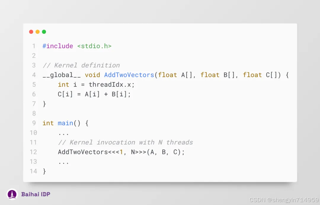 若想定义这类 kernel,可运用 __global__ 关键字作为声明限定符(declaration specifier),而若欲设定执行该 kernel 的具体 CUDA 线程数目,则需采用 <<<...>>> 来完成: