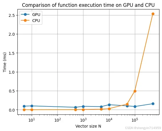 下表展示了在处理不同大小向量的加法运算时,CPU 与 GPU 的计算性能对比情况。