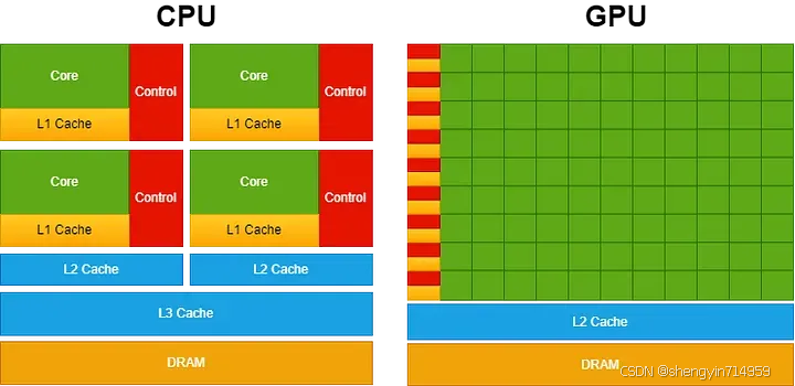 为了实现更出色的并行计算能力,GPU 在设计上倾向于将更多晶体管资源(transistors)投入到数据处理中,而非数据缓存(data caching)和流控机制(flow contro),这与 CPU 的设计思路大相径庭。CPU 为了优化单一线程的执行效率和复杂指令集的处理,特意划拨了大量的晶体管来加强这些方面的性能。下图生动地描绘了 CPU 与 GPU 在芯片资源分配上的显著差异。