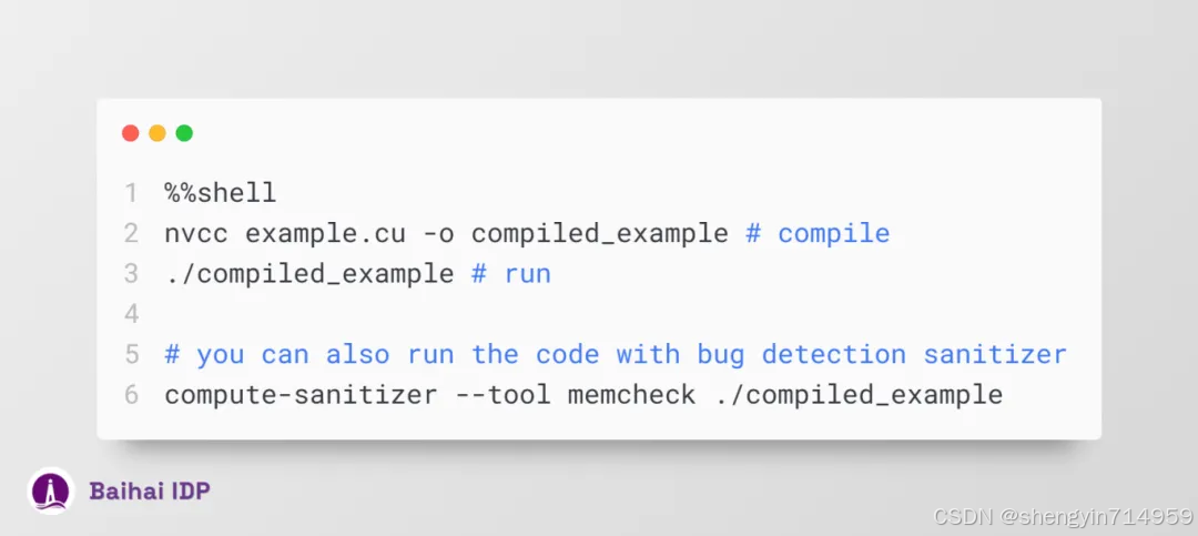 要编译和运行 CUDA 代码,首先需要确保系统中已装有 CUDA 工具包(CUDA toolkit)。紧接着,使用 nvcc —— NVIDIA CUDA 编译器完成相关代码编译工作。