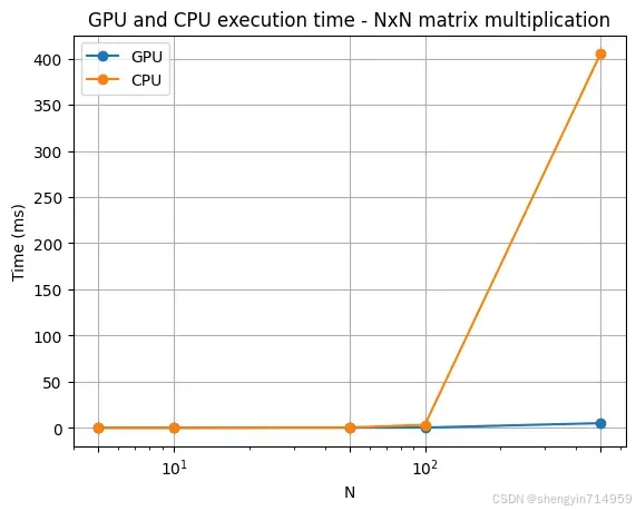 我们可以注意到,在 GPU 版本的矩阵乘法算法中,循环次数明显减少,从而显著提升了运算处理速度。下面这张图表直观地展现了 N x N 矩阵乘法在 CPU 与 GPU 上的性能对比情况: