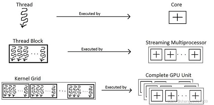 因此,在一份使用 CUDA 撰写的基本代码(basic code)中,程序主体在 host (CPU) 上执行,随后将数据传递给 device (GPU) ,并调用 kernels (functions) 在 device (GPU) 上并行运行。这些 kernels 由多条线程同时执行。运算完成后,结果再从 device (GPU) 回传至 host (CPU) 。