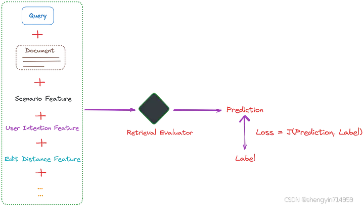 通过向检索评估器的训练数据中融入场景特征(scene features),能有效增强其评估文档相关性的能力。此外,还可以引入用户意图(user intentions)、文本差异度(edit distance)等因素作为辅助特征,如图 6 所示: