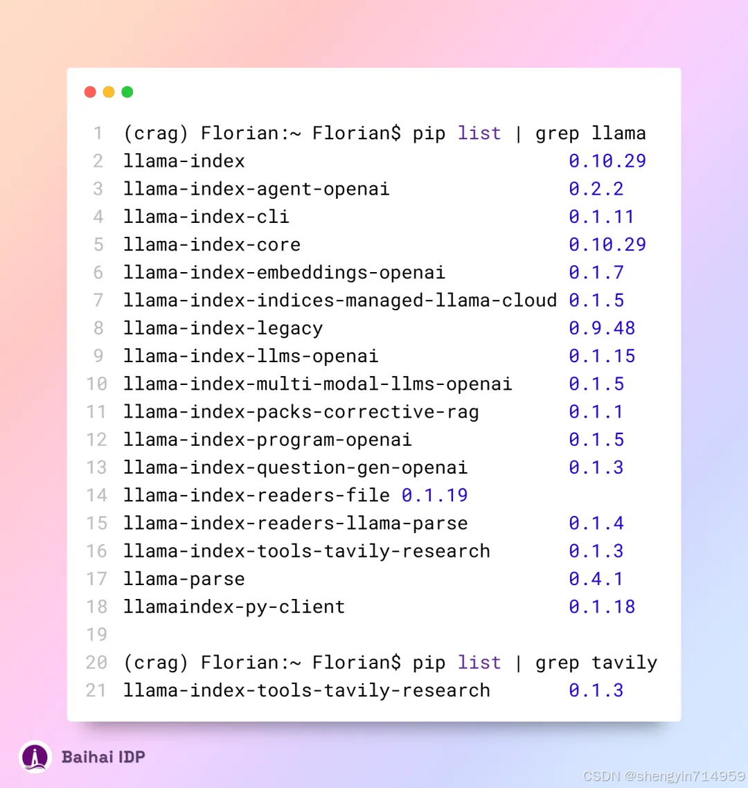 安装完成后,LlamaIndex 和 Tavily 的相应版本如下: