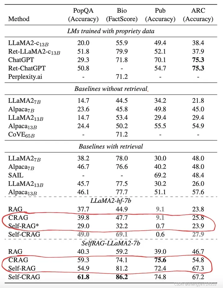 图 5:四大数据集相关测试集上的全面评估结果。这些结果依据不同的 LLM 分类展示。其中,加粗数值表示所有方法和 LLM 中的最优表现;而灰色的加粗数值,则表示特定 LLM 的最佳性能。标注星号(*)的内容是通过 CRAG 重新验证得到的结果,其余结果均直接引述自相关研究文献。Source: 《Corrective Retrieval Augmented Generation》