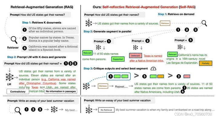 图 1 将 RAG 和 Self-RAG[2] 的主要流程进行了比较: