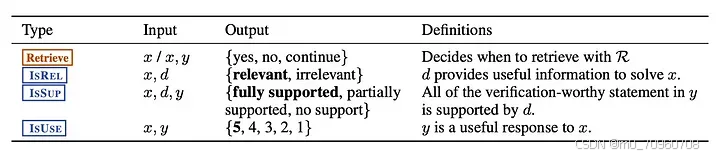 图 2:Self-RAG 中使用的四种 reflection tokens 。每种类型都使用多个 tokens 来表示其输出值(output)。底部三行是三类 critique tokens ,粗体字表示这一类中最理想的 critique tokens 。x、y、d 分别表示输入(input)、输出(output)和相关段落(relevant passage)。来源:Self-RAG[2]