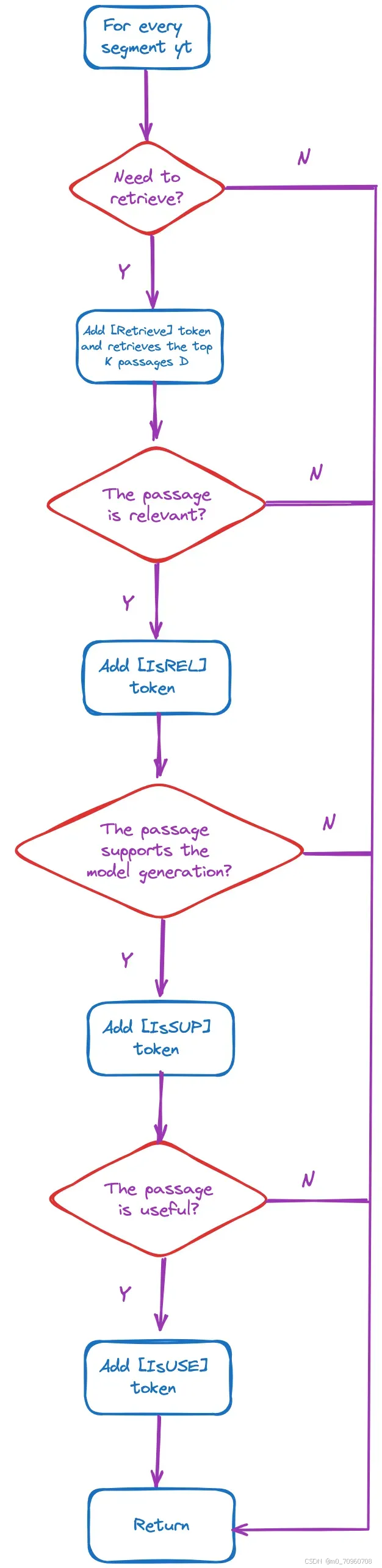 图4:收集生成模型(generator)的训练数据。图中的每次条件判断都是通过批判模型 C 执行的。该图片由作者提供,灵感来源于 Self-RAG[2] section 3.2.2 。