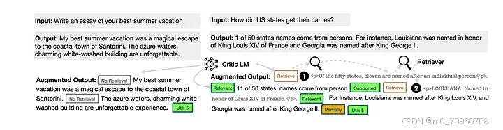 按需检索(Retrieval as Needed) : 当模型需要检索信息时,例如查询"美国各州的名字是怎么来的?"(图 1 右上方)时,模型输出中会包含一个 [Retrieve] token,表示需要检索与 Query 相关的内容。相反,当被要求写 “写一篇主题为 ‘记忆中深刻的暑假’ 的文章”(图 1 右下方)时,模型会选择直接生成答案,无需进行检索。
