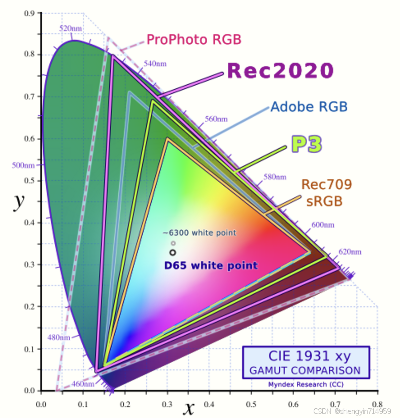包含BT709和BT2020的色彩空间示意图如下,由此可见,BT2020比BT709有更宽的色域。